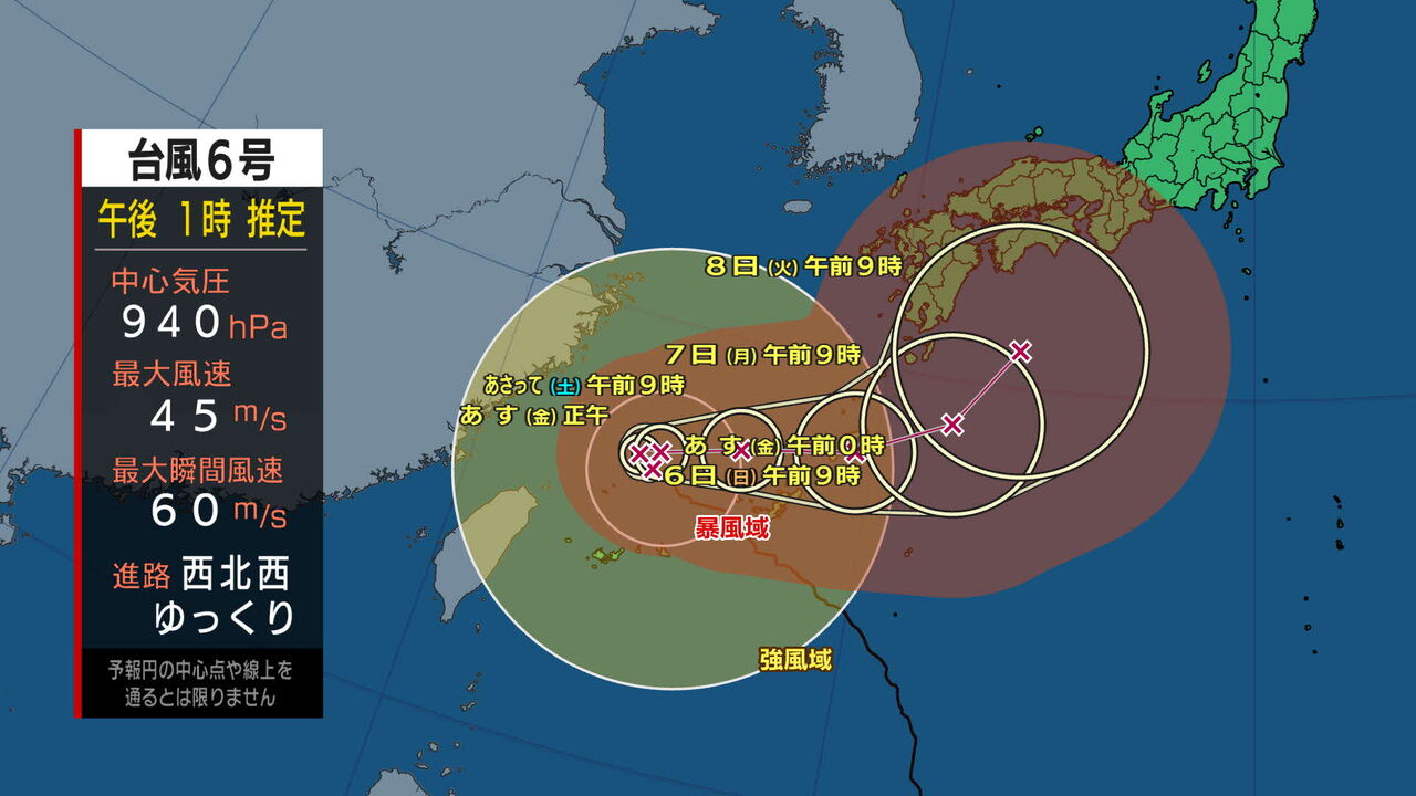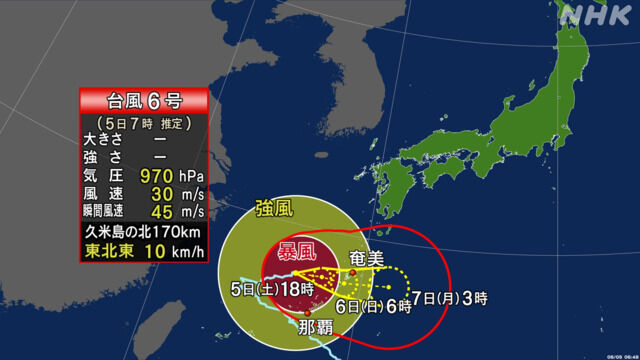 気象庁によりますと、台風6号は午前7時には久米島の北170キロの海上を1時間に10キロの速さ