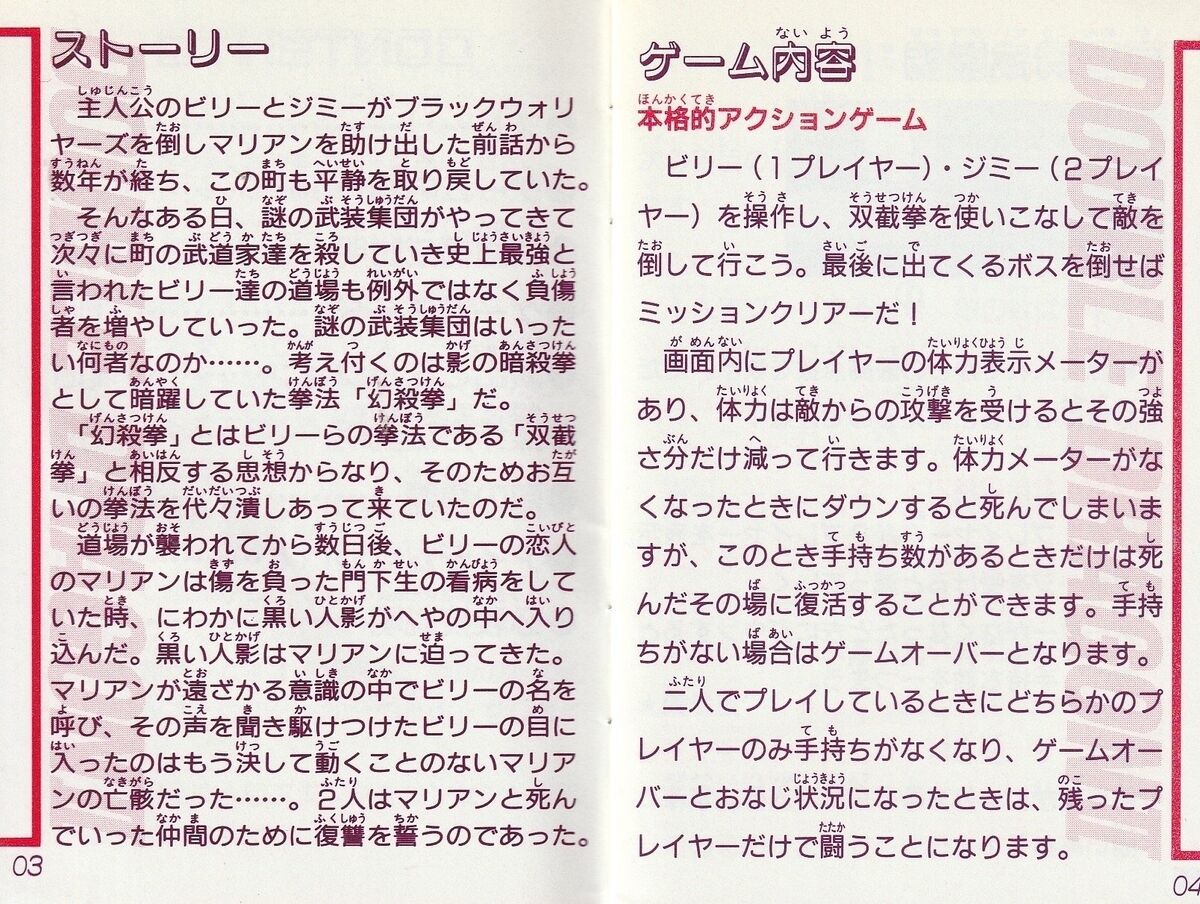 プレイヤーは、ビリー・リーとジミー・リーという2人の格闘家を操作し、敵を次々と倒していく。攻撃はパンチ、キック、投げ技など多彩で、敵を空中に打ち上げてから攻撃するコンボも可能。また、ステージには様々な仕掛けが施されており、それらを駆使して敵を倒していくのも楽しい。