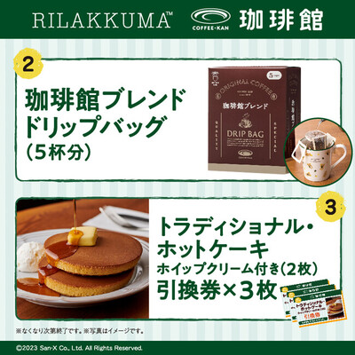 サンエックス株式会社(本社:東京都千代田区、代表取締役社長:千田 洋史)は、C-United株式会社(本社:東京都港区、代表取締役社長:友成 勇樹)が展開する全国の『珈琲館』・『珈琲館 蔵』・『CAFE DI ESPRESSO珈琲館』にて、「リラックマ」と初のコラボレーションに伴い、「リラックマ」のオリジナルグッズやドリップバッグ、トラディショナル・ホットケーキ引換券など、4つのアイテムが入った期間限定のオリジナルハッピーバッグが、2023年12月15日(金)より数量限定で発売されることをお知らせします。