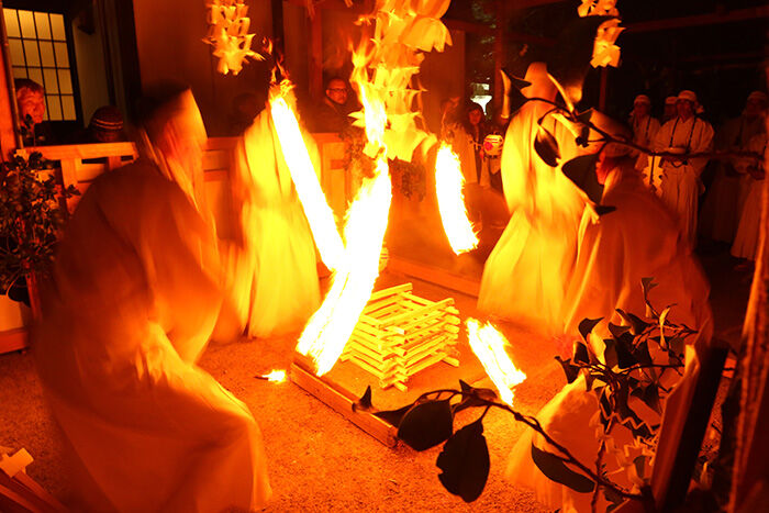 厳かな読経が境内に響き渡る火防大祭大祈祷からはじまり、神輿渡御、松明道中、火渡り修法、深夜に秘法七十五膳御供式が行われます。16日0時に法話があり、奉納者にはお札と眷属に捧げた御神饌が授けられ、6時には神輿還御となり、火まつりが終わります。陽が落ちた後、階段の隅に並んだ六角形の白い筒に明かりが灯されます。参拝者が三々五々境内に集まり始め、松明道中を待ちます。白装束に身を包んだ人達が吹く法螺貝が聞こえはじめると、天狗の面を頭に杖をつきながら歩く人々の後を、おとな3人でなければ担げないほどの長い竹の松明、2人で担ぐ細い竹の松明、片手に松明を掲げた一般参加者が続きます。