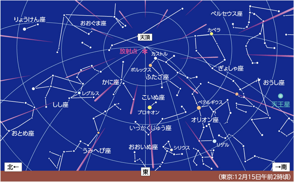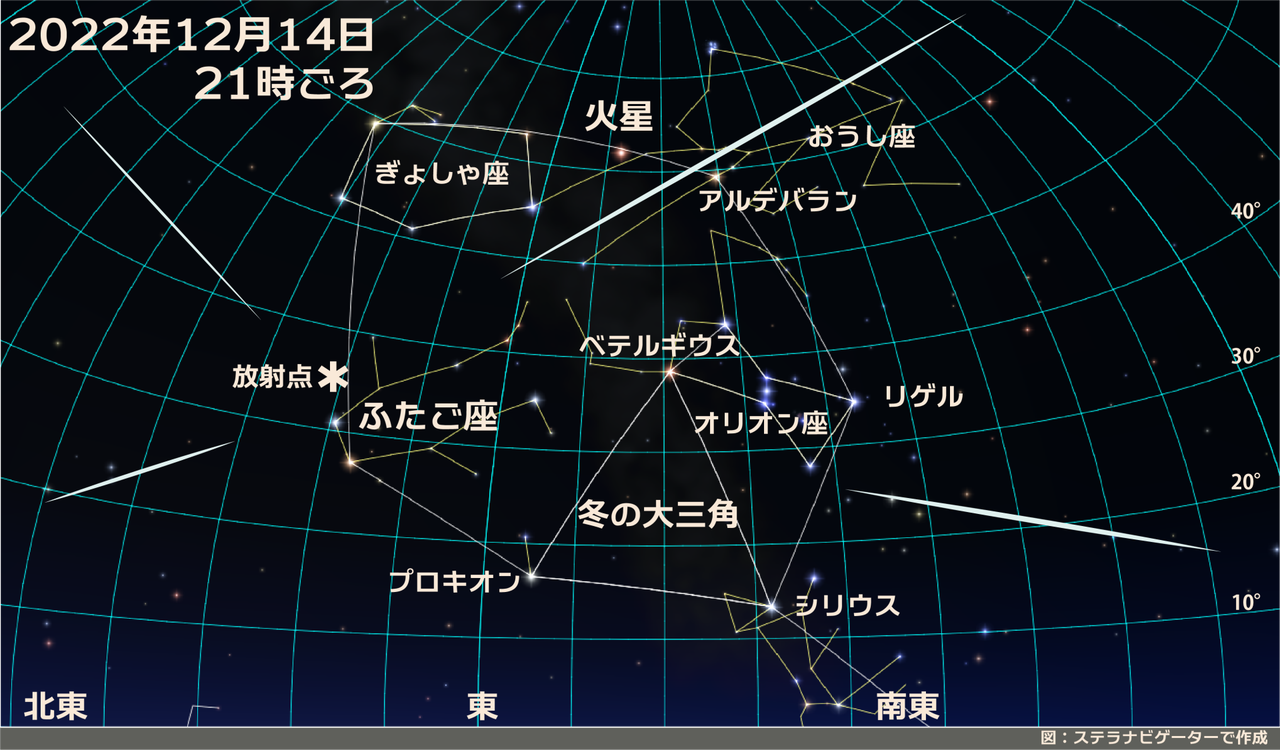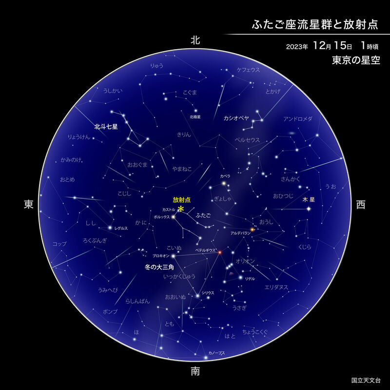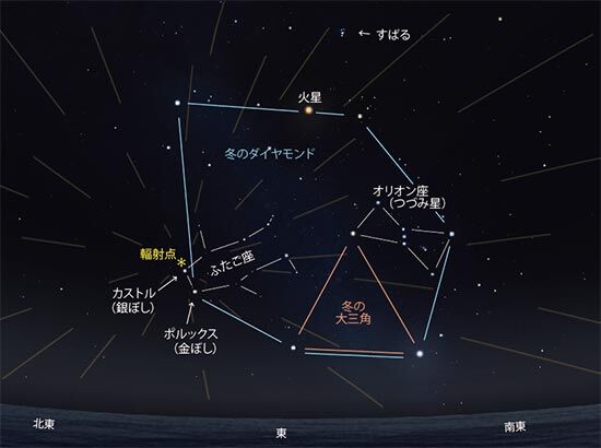 なかでも、ふたご座流星群は多くの流れ星が見られることから「しぶんぎ座流星群」、「ペルセウス座流星群」などとあわせて三大流星群とも呼ばれており、毎年12月の14日から15日前後に見られるということです。