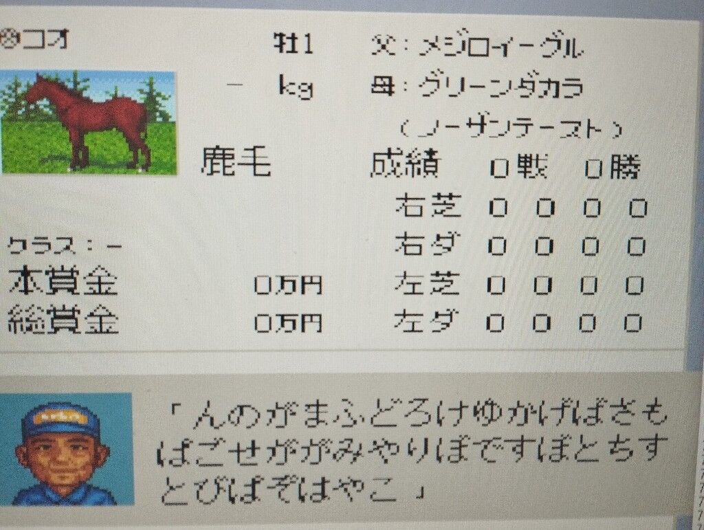 わかります?これ?1度1/65536をひくまでセーブロード繰り返して、引いて予定通りの馬を確認したらやり直して、毛色をどうにか変えるために調教して種付けしてセリ市いって種付けしてVTRみて種付けして