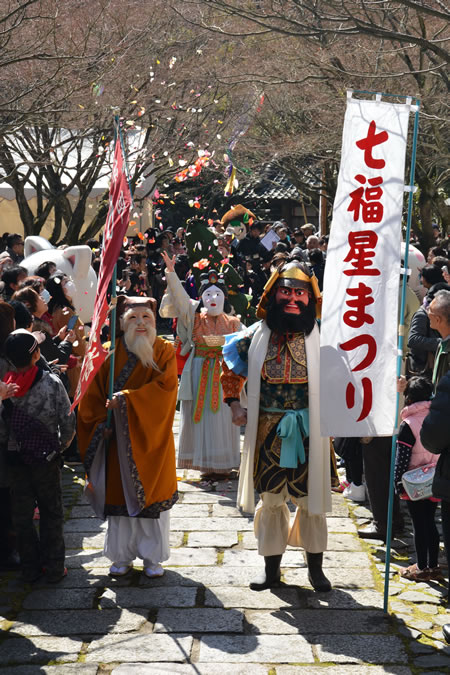 七福神が僧侶、年男、年女と共に参道を練り歩く「七福神行列」や、子供たちと一緒に歩く「七福稚児行列」も見どころの一つです。その他、お福分けの輪投げや観音市など、楽しい催し物が行われます。
