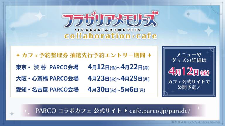 @fragaria_goods5月から初のコラボカフェ 「フラガリアメモリーズ collaboration cafe」が開催! 4月12日(金)から抽選先行予約エントリーを順次開始! fragariamemories.sanrio.co.jp/news/post-30/ pic.twitter.com/3eGRNuljBW