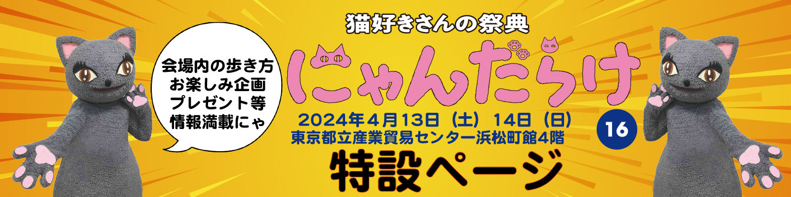 16回目を迎える猫好きさんの祭典「にゃんだらけ」が、4月13日(土)14日(日)東京都立産業貿易センター浜松町館で開催されます。毎回、趣向を凝らした場内企画と多彩なプレゼントで猫好きさんに喜んでいただいているにゃんだらけ。今回も盛りだくさんです