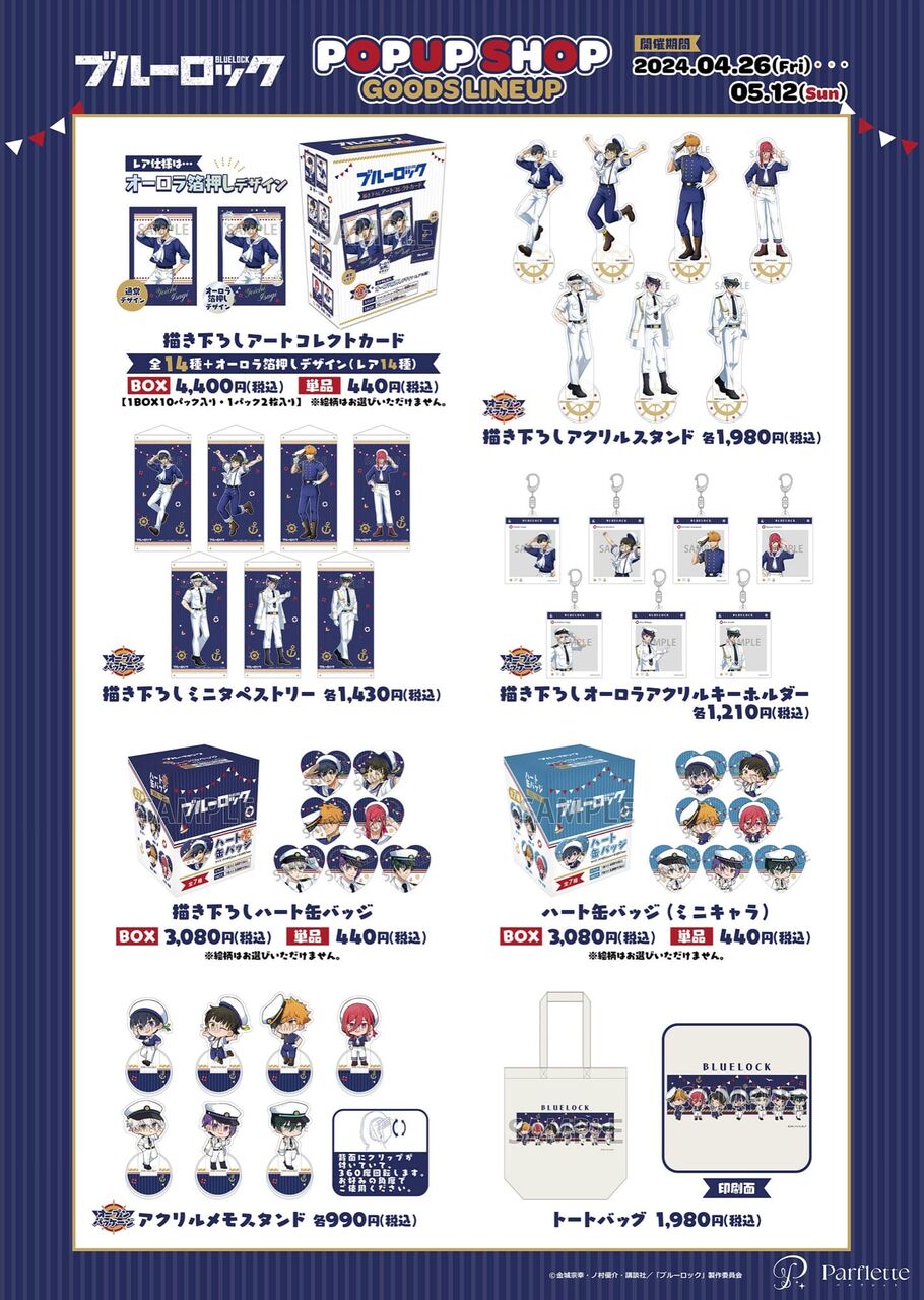 @NANASHOKUnoNIJI『開催場所 東京アニメセンター 開催期間 4月26日〜5月12日』 『関連グッズを 2,000円(税込)購入するごとに 特典として「ポストカード (全14種)」を ランダムに1枚プレゼント!』 ブルーロック マリンルック ストア in 渋谷 4月26日よりコラボ開催! collabo-cafe.com/events/collabo…
