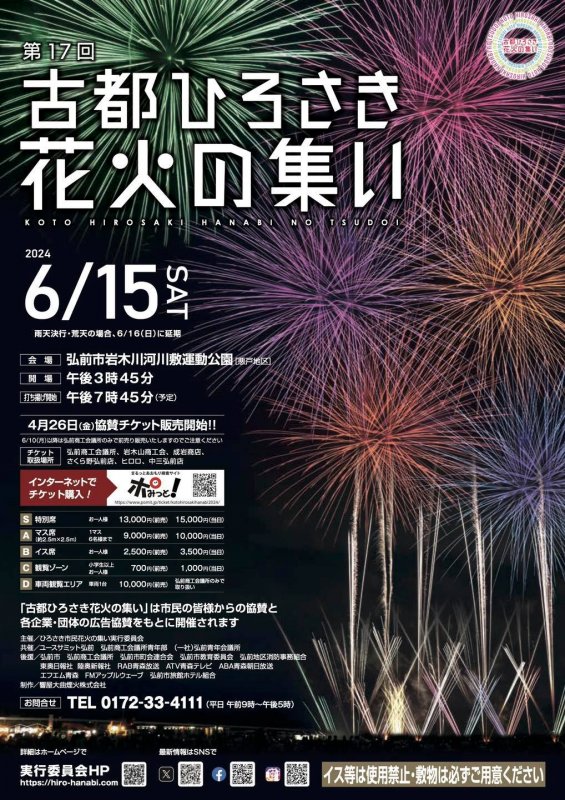 @Hirosaki_City第17回古都ひろさき花火の集い ▽とき 6月15日㈯、午後7時45分打ち上げ開始(予定) ※雨天決行、荒天の場合は6月16日㈰に延期。 ▽ところ 弘前市岩木川河川敷運動公園(悪戸地区) チケット販売など詳しくはこちら↓ city.hirosaki.aomori.jp/oshirase/sangy… pic.twitter.com/kpUGqfvdMK