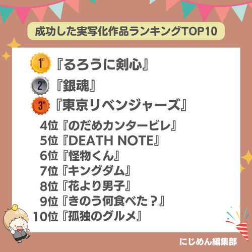 @nijimen成功したと思う 実写化作品ランキングTOP10🎬 第1位🥇『るろうに剣心』 迫力あるアクションシーンが魅力 第2位🥈『銀魂』 原作リスペクトのギャグシーンが最高 第3位🥉『東京リベンジャーズ』 注目の若手俳優による熱演に心打たれる nijimen.net/topics/481335 pic.twitter.com/P4AlmkRWwK
