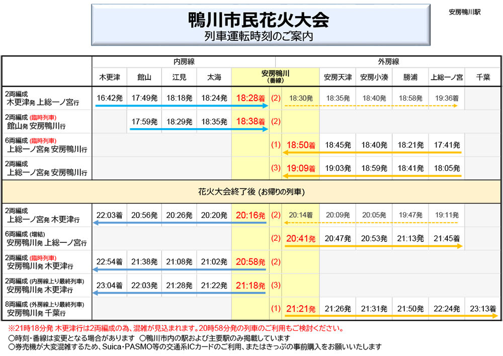 @kotsunoreporter2024年7月29日(月) 「鴨川市民花火大会」臨時列車情報 打ち上げ会場最寄り駅の安房鴨川駅を発着する臨時列車が運転されます🚃🎆 ※一部定期列車の行先変更および両数変更あり pic.twitter.com/ImiCcWw3qL