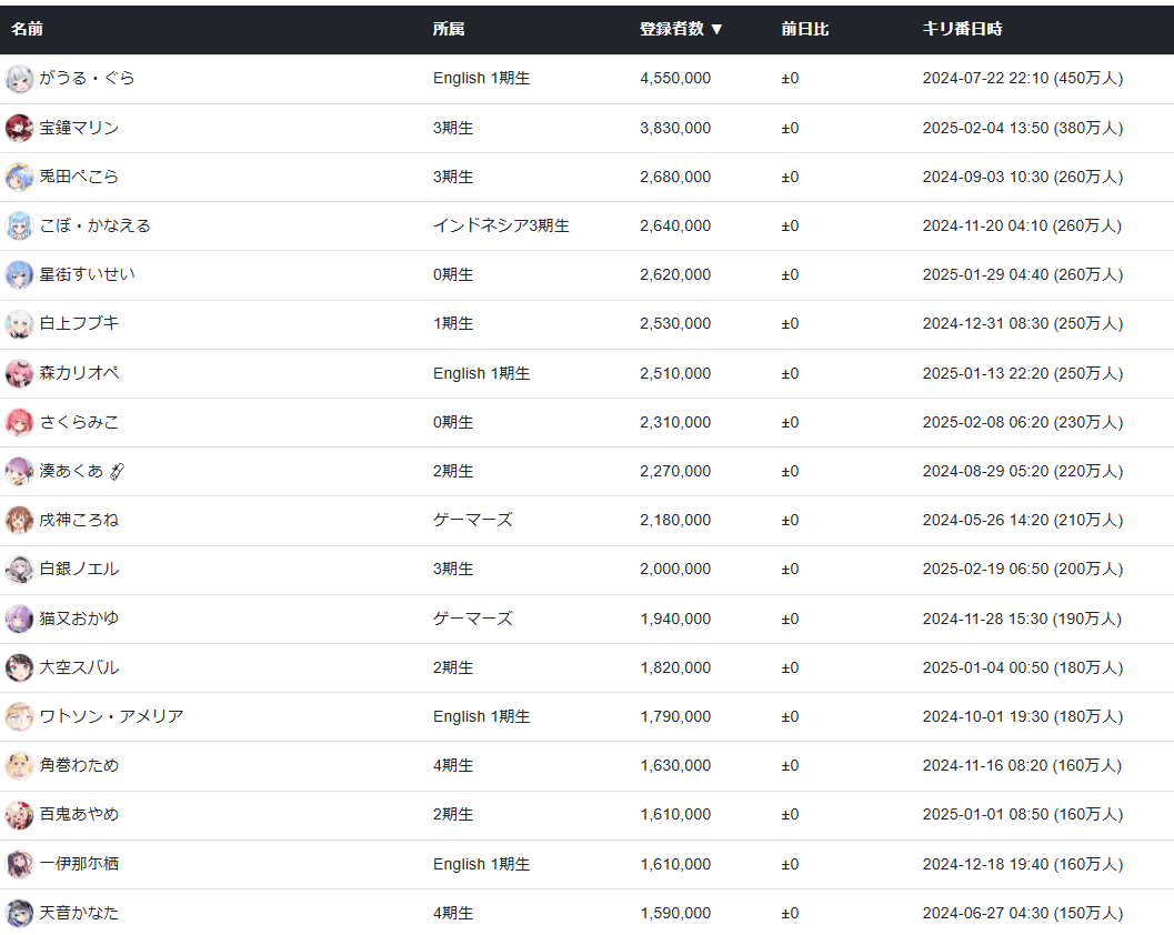 この前みこち200万人行ったなぁって思ったら今はぺこらと30万くらいの差まで縮まってる