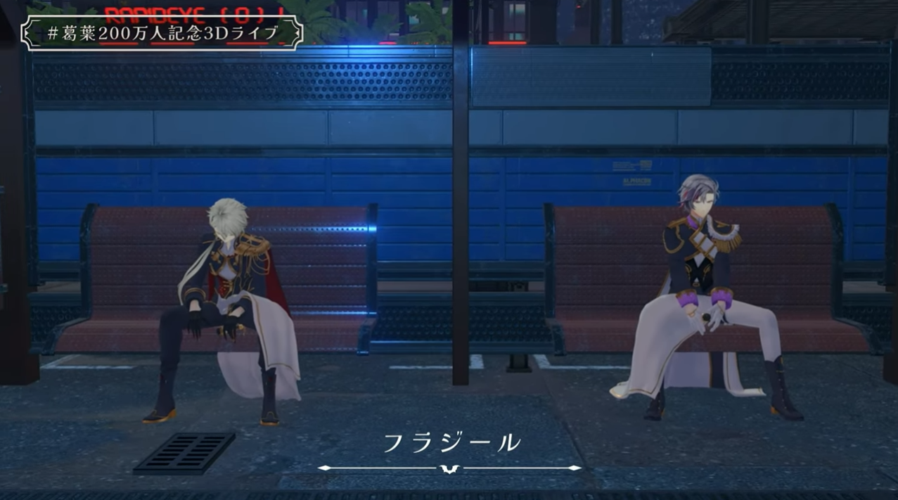 @73nami_928不破湊とのフラジール、ステージにまず目がいった バス停のベンチ?後ろのモニターぽいのに映像流れてるのも凝ってて3D技術の進歩にびっくり 葛葉が椅子使った演出好きだって知ってるから、いや本人は楽だからとか言うけど、小道具として使い慣れてて魅せ方が一段と洗練されてるって感じた