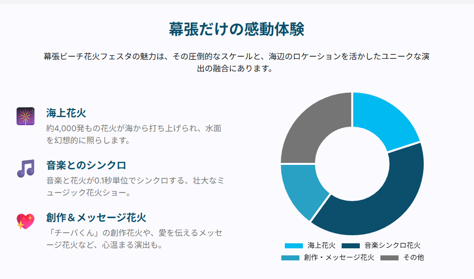幕張ビーチ花火フェスタは、その規模と演出のユニークさから、国内でも特に人気の高い花火大会の一つです。