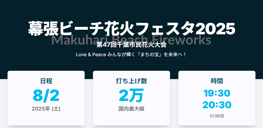 「Love & Peace みんなが輝く『まちの宝』を未来へ!」をテーマに、2025年も開催される幕張ビーチ花火フェスタ。例年通り、夏真っ盛りの8月初旬に開催されます。