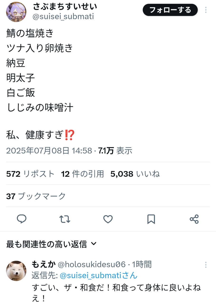 引用元: 【朗報】星街すいせいちゃん、本日の朝食を公開!☺ https://mi.5ch.net/test/read.cgi/news4vip/1751960594/