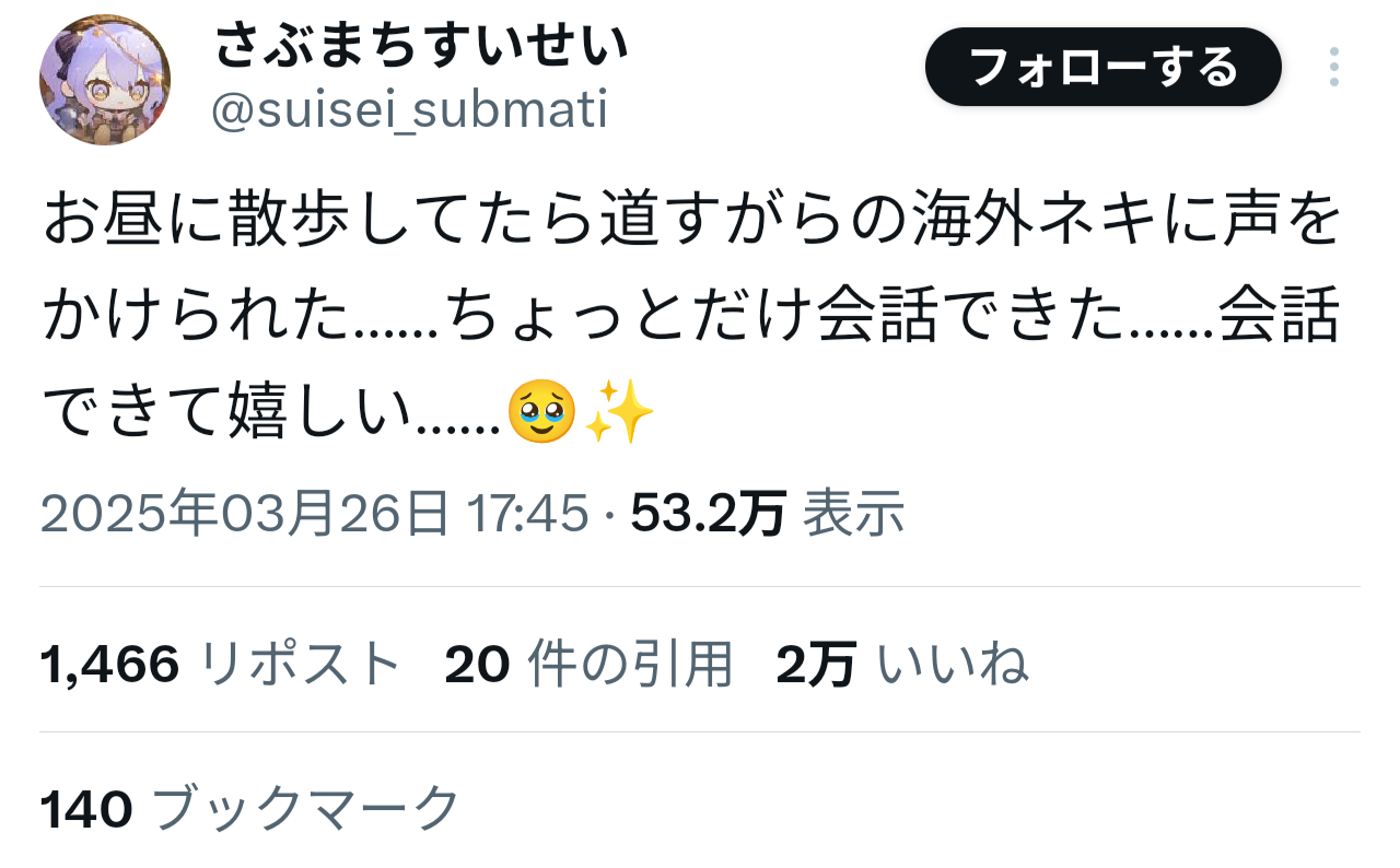 引用元: 【朗報】星街すいせいちゃん、外国人に話しかけられて英語で会話した事を報告 https://nova.5ch.net/test/read.cgi/livegalileo/1754397356/