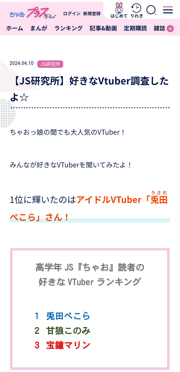 @hiro88x【JS研究所】2025年最新版!ちゃおっ娘が好きなVTuberランキング☆ - ちゃおプラス ciao.shogakukan.co.jp/topics/193458/ 1位:宝鐘マリン(ホロライブ) 2位:甘狼このみ(ミリプロ) 3位:星街すいせい(ホロライブ) 同率4位:でびでび・でびる(にじさんじ)、ルンルン(にじさんじ)